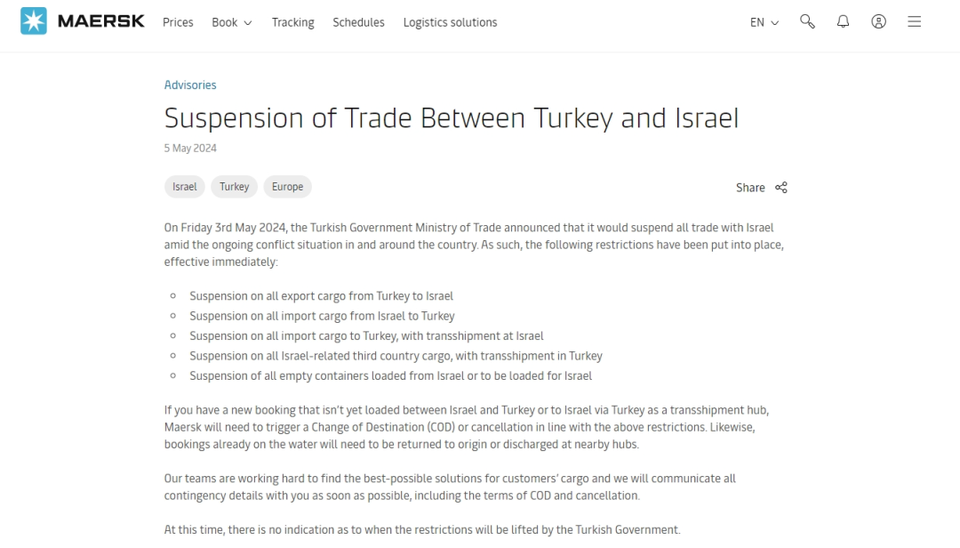 根据马士基此前预测,红海局势对航运业的干扰或将持续到今年年底。另一方面,因为土耳其宣布暂停与以色列的所有进出口贸易,5月5日,马士基官网发布暂停土耳其和以色列之间的进出口贸易、转运和订舱,具体实施限制如下,并立即生效: