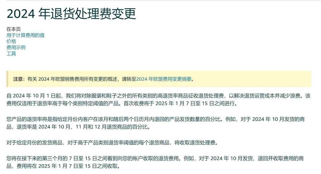 亚马逊后台信息显示,自2024年10月1日起,将对除服装和鞋子外的所有类别的高退货率商品征收退货处理费。首次收费将于2025年1月7日至15日之间启动。
